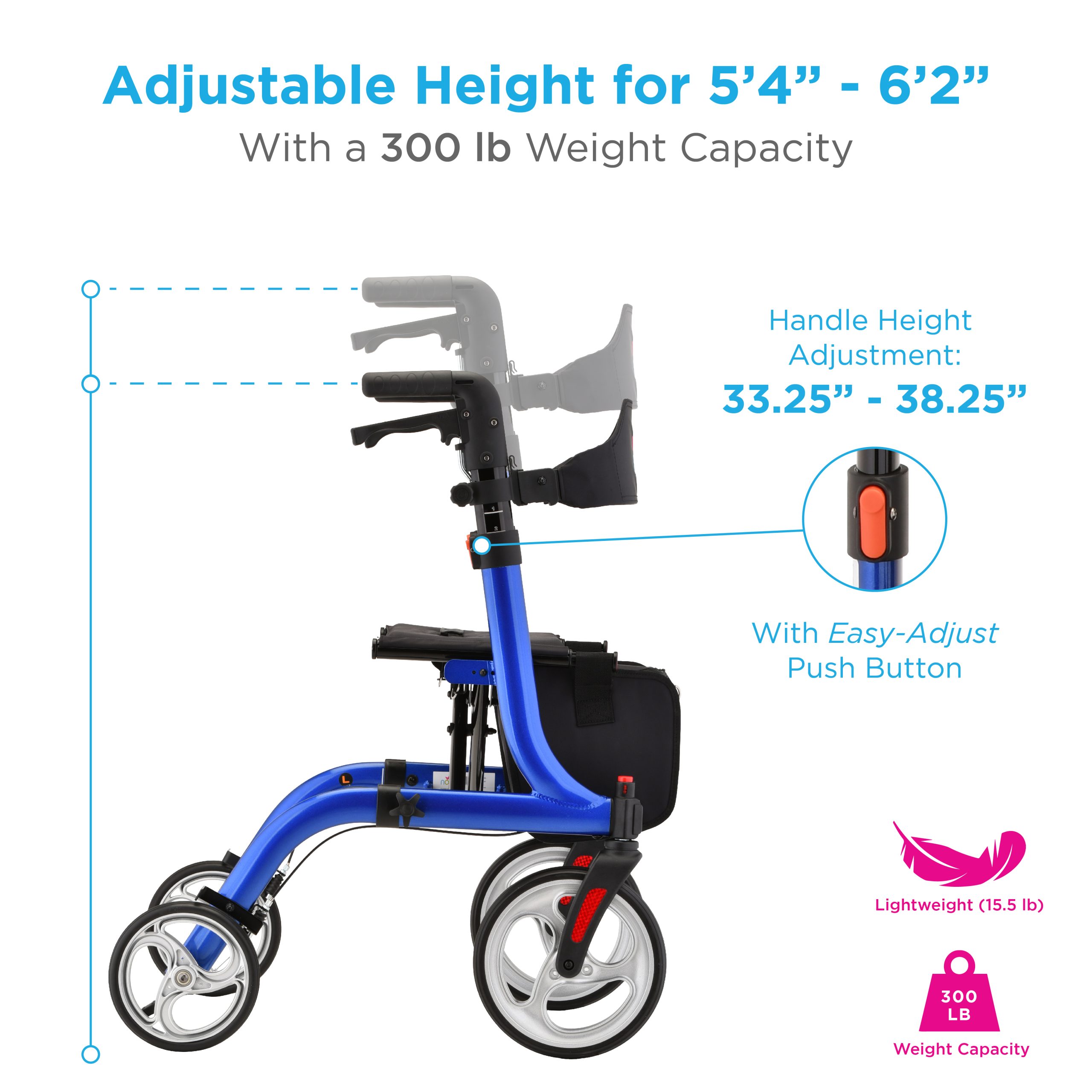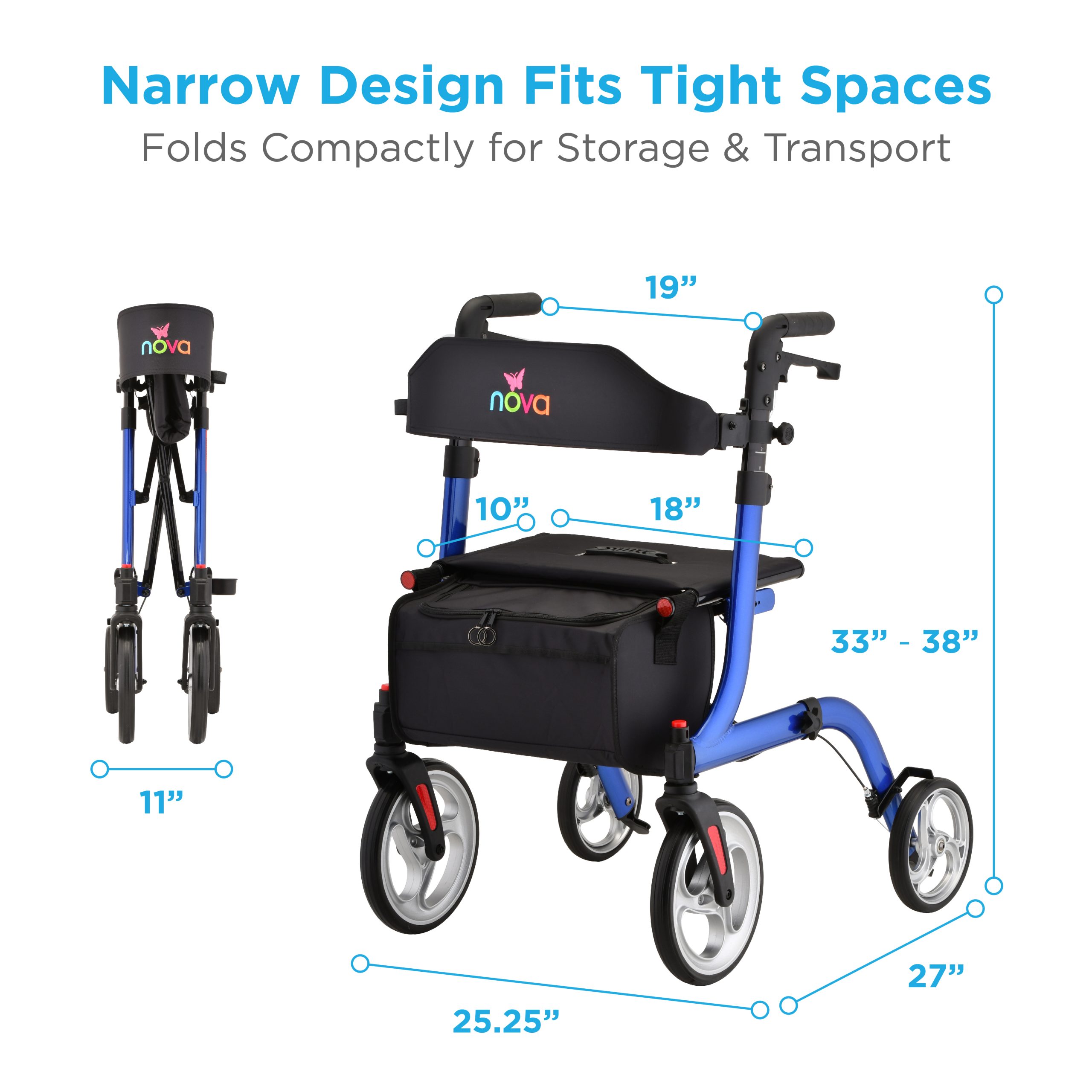 The Express Rollator by NOVA brings a fresh, modern look to mobility with superior performance and comfort. Designed for users on the go, it features large 10″ front wheels for smooth handling indoors and outdoors, a sleek frame that folds easily for transport, and a comfortable built-in seat with removable padded cover. The locking hand brakes, extra-wide backrest, and under-seat storage pouch make the Express a top choice for both stability and style.
